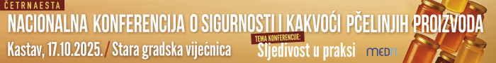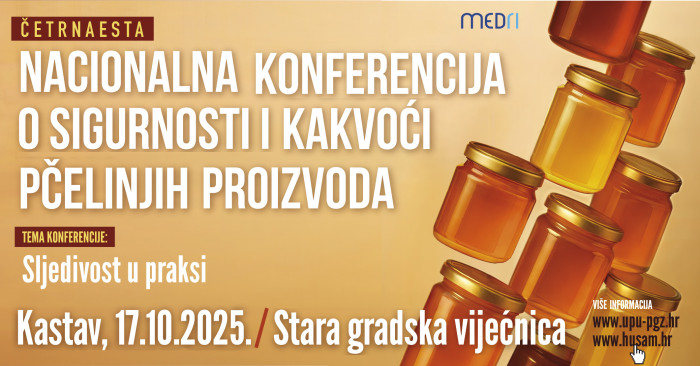 ČETRNAESTO tradicionalno nacionalno okupljanje proizvođačke, stručne i znanstvene zajednice na temu sigurnosti i kakvoće pčelinjih proizvoda. Ove se godine, uz sudjelovanje uglednih gostiju iz inozemstva, održava na temu “Sljedivost u praksi”. Datum održavanja je 17. listopada 2025. godine. Mjesto održavanja je stara Gradska vijećnica u Kastvu (Trg Lokvina 3, 51215, Kastav). Ova je konferencija postala tradicionalni skup, jedinstven po tome što se na jednom mjestu sastaju predstavnici primarne pčelarske proizvodnje i pčelarske znanosti. Ove godine je naglasak dan na jasno definiranu odgovornost svih subjekata u proizvodnji hrane vezano uz osiguranje sljedivosti. Posebno je to aktualno u svijetlu donašanja nove Europske Direktive o medu koja to sada i posebno naglašava. Pokušat ćemo dati odgovor na pitanja znamo i što imamo i cijenimo li dovoljno potencijal toga što imamo? Želimo istaknuti cijeli niz predradnji koje se moraju napraviti kako bi taj potencijal došao do punog izražaja. Taj proces nije lagan jer je cijeli niz izazova s kojima ćemo se susresti na tom putu. To se posebno odnosi na brigu o realnim problemima u praksi, ali isto tako i mehanizmima koji su nam na raspolaganju da se uspješno nosimo s time. Sudjelovanje je slobodno za sve zainteresirane!